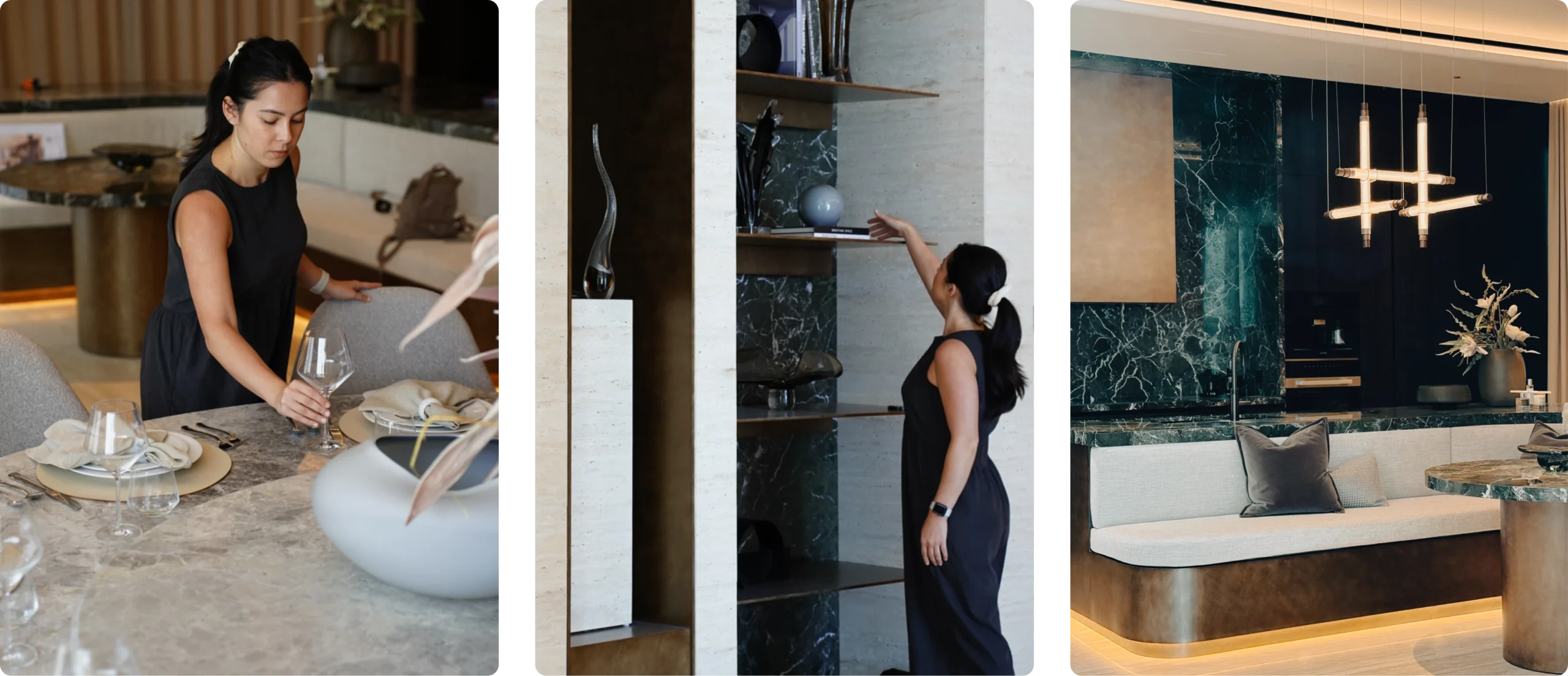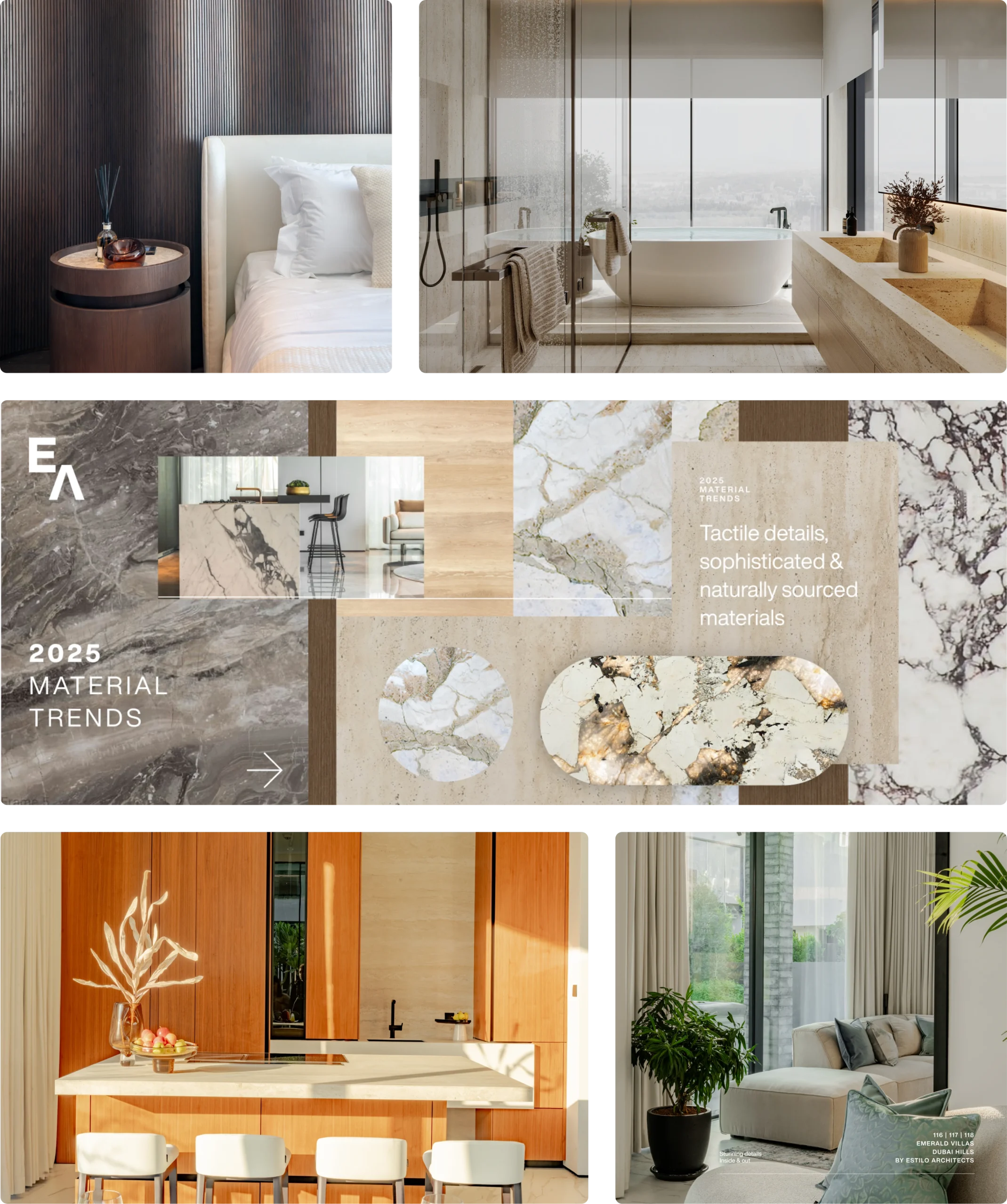 It starts on site — hands on surfaces, reading a room before it’s finished. Last year, we spent a lot of time in spaces that were still becoming themselves: running fingers along travertine columns, adjusting shelves against dark marble, getting the details right at the dining table before a single resident moved in. That hands-on process is where our material choices get tested. And it’s why we kept reaching for the same ones.